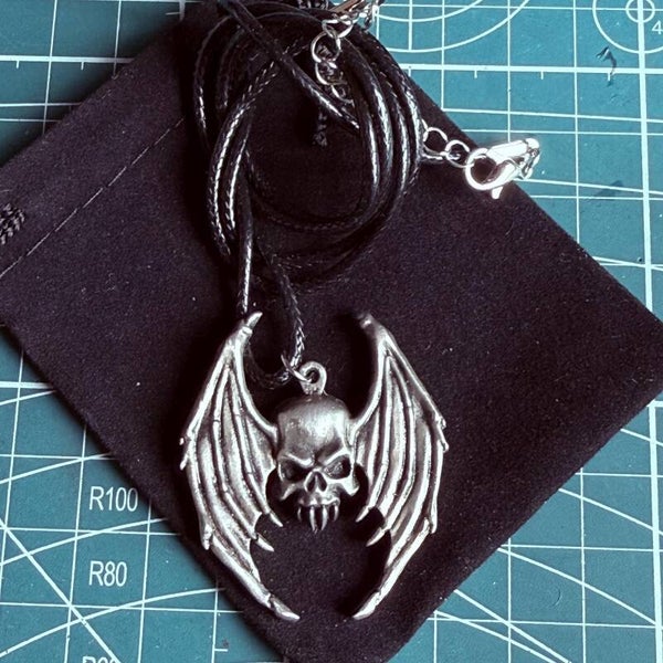 Unleash your chaos side with this striking bat-winged skull pendent, crafted from solid pewter. The detailed sculpting captures chaos energy.